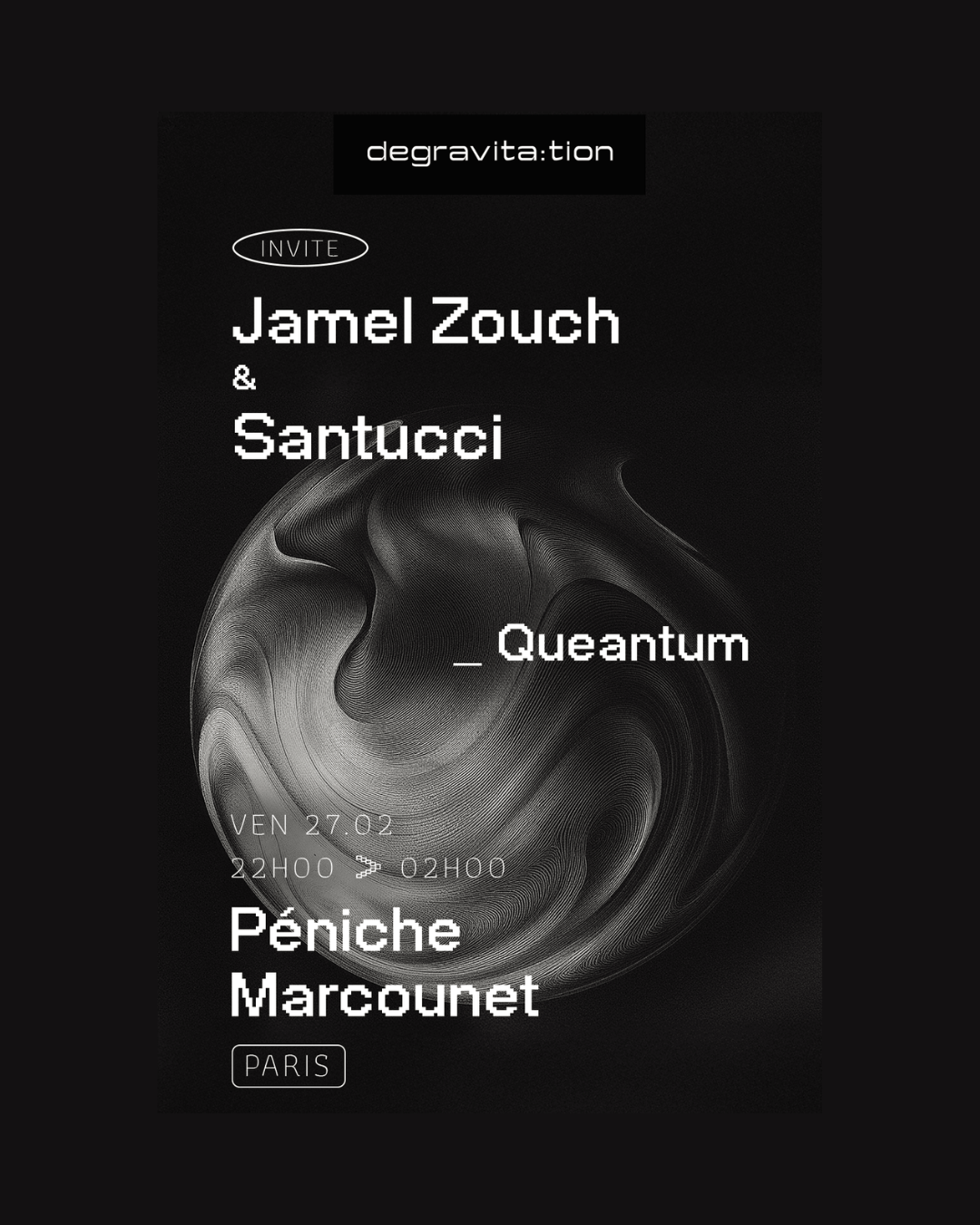DEGRAVITA:TION ven 27 Fév 22h00 - 2h00 DEGRAVITA:TION ven 27 Fév 22h00 - 2h00 https://shotgun.live/en/events/degravita-tion-invite-jamel-zouch-santucci DEGRAVITA:TION